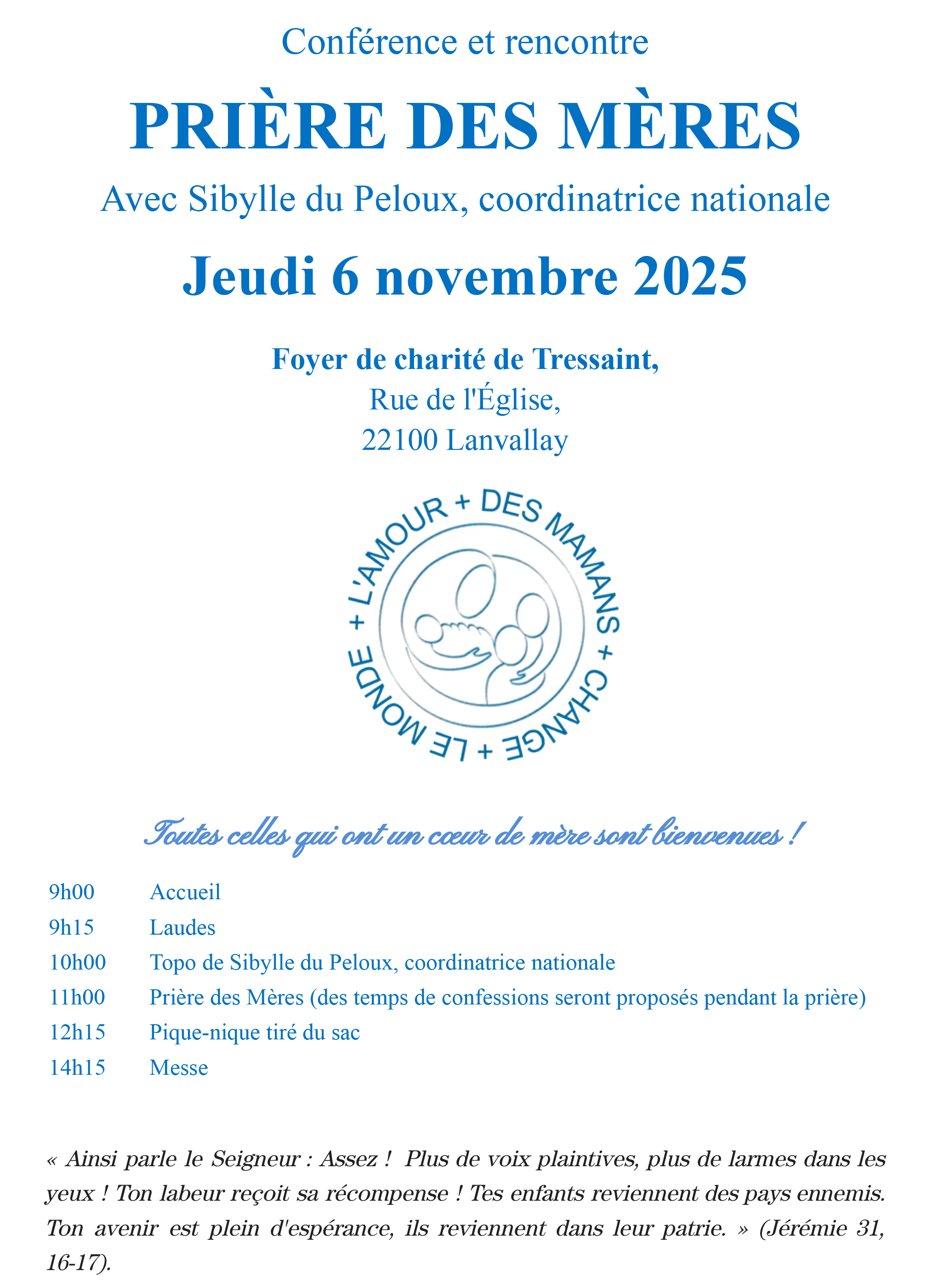 Conférence et rencontre PRIÈRE DES MÈRES Jeudi 6 novembre 2025 à Lanvallay