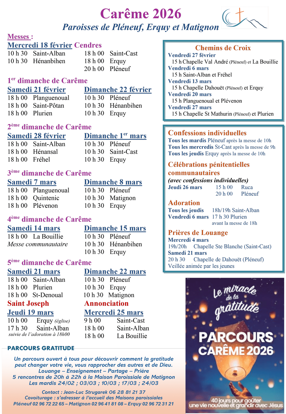 Carême 2026 – Paroisses de Pléneuf, Erquy et MatignonPublié le 18 février 2026 | Télécharger en cliquant sur le lien